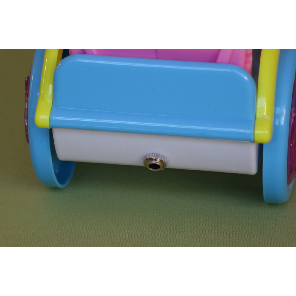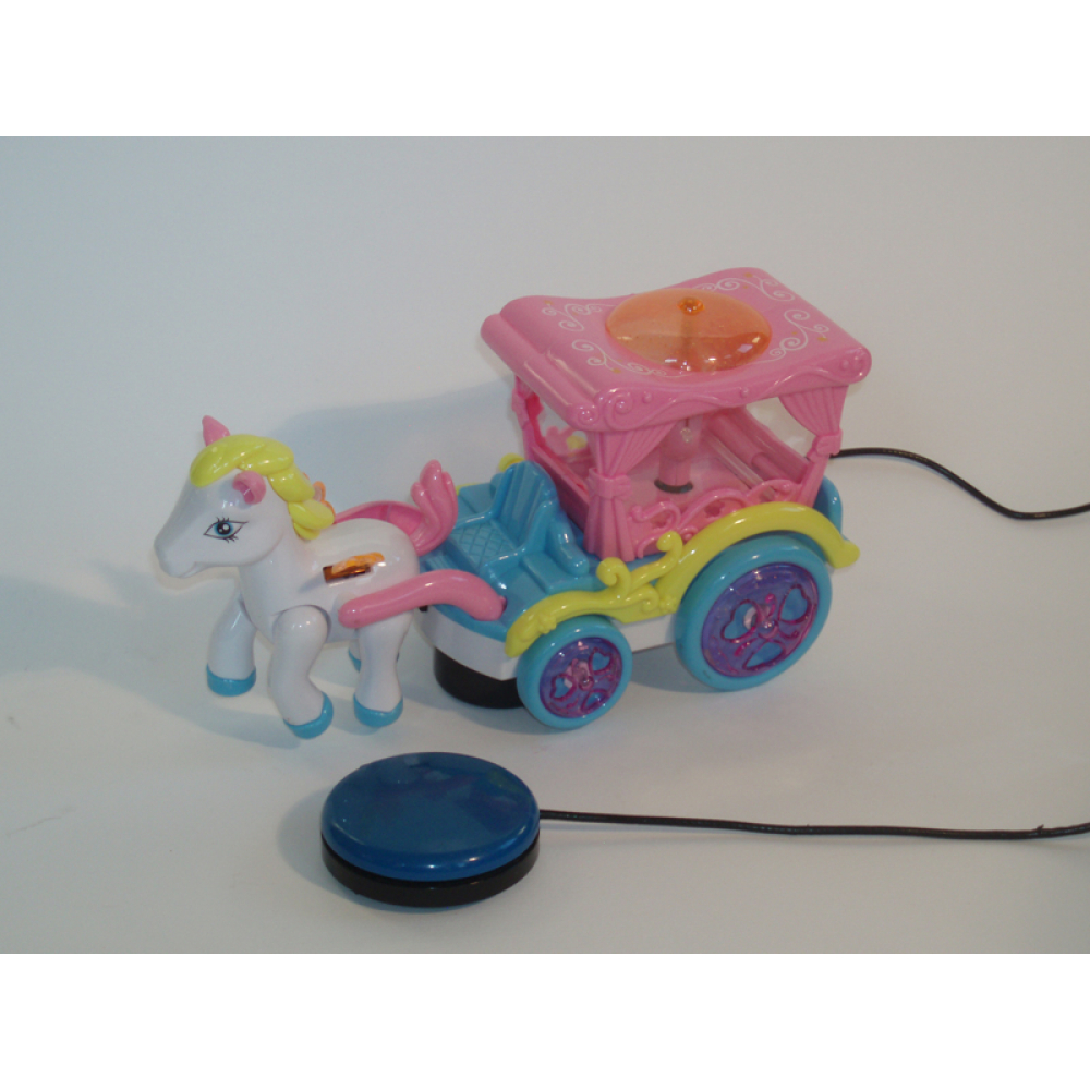 Bij het ingedrukt houden van de knop gaan de paarden lopen en trekken de koets. Er klinkt een gezellig muziekje. Via het aan/uit schakelaartje kan gekozen worden om de muziek aan of uit te zetten. Alle andere functies blijven dan natuurlijk wel gewoon werken. Ook is branden er mooie lampjes in de koets.