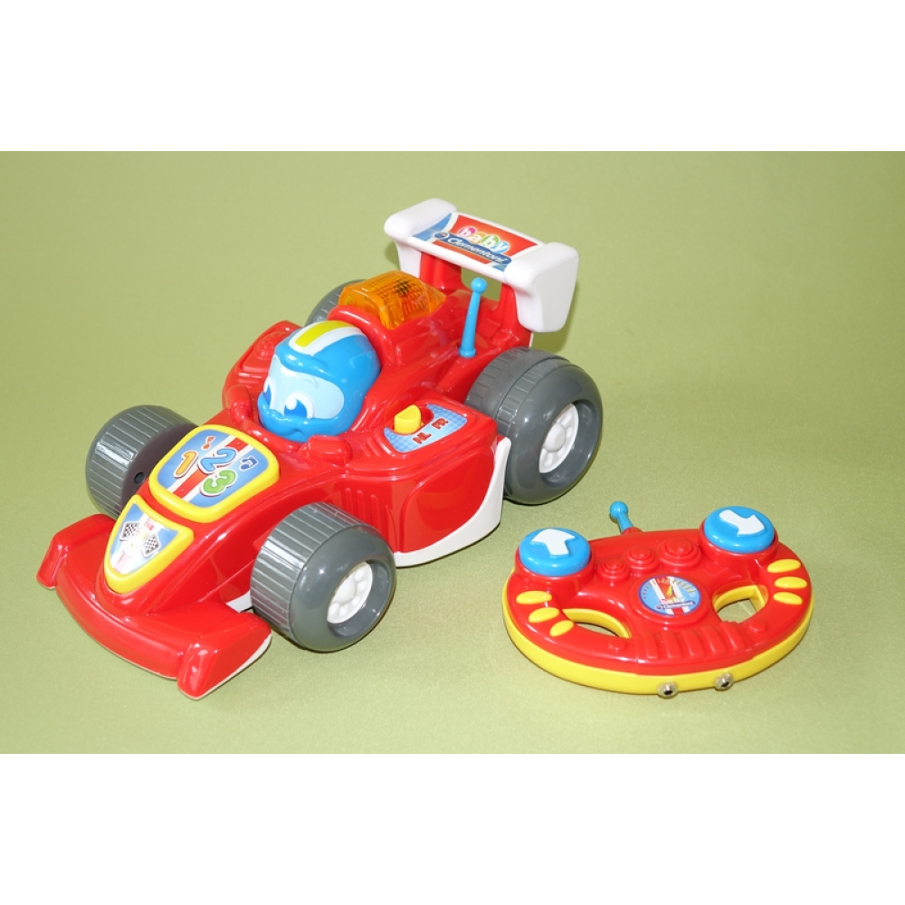 Deze grappige rode raceauto is met twee losse schakelaars of de adremo hoofdsteun (tussenstekkertje niet inbegrepen) te besturen. De ene schakelaar laat de raceauto rechtdoor rijden en de andere schakelaar zorgt dat hij een bocht achteruit maakt. Wanneer de raceauto vooruit rijdt hoor je de wielen tikken. De auto praat gezellig en nodigt het kind uit om weer een actie te ondernemen. Ook zitten er liedjes en geluiden in. Je kan kiezen voor Nederlands of Frans. Op de auto zitten een aantal knoppen waar op gedrukt kan worden om geluidjes te horen. Ook zit er een automatische stand op.